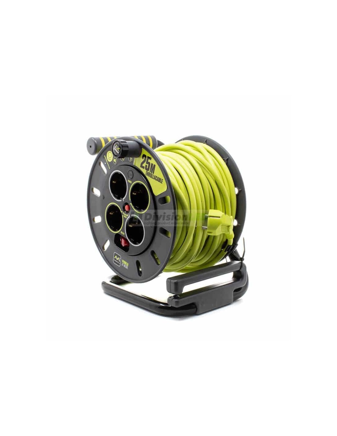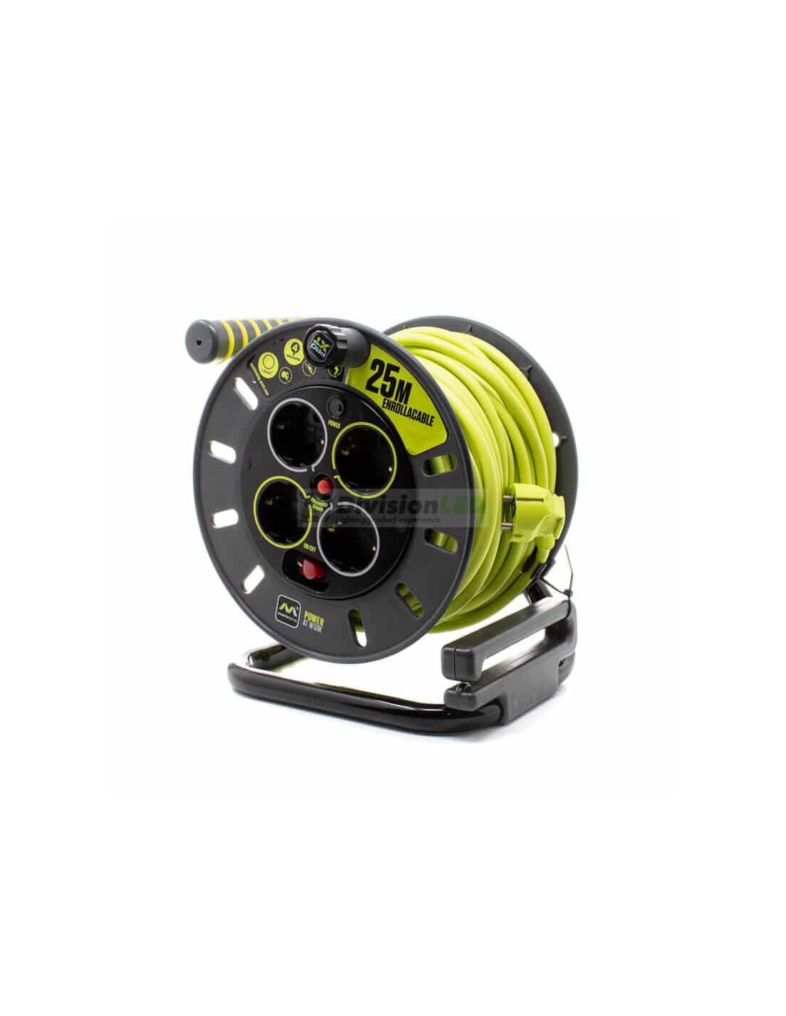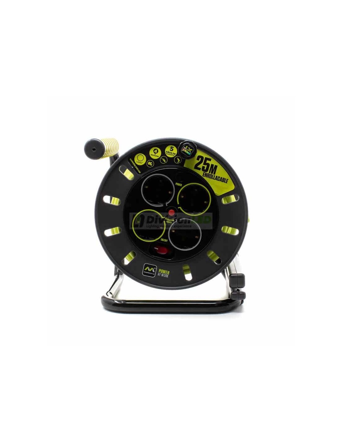 El enrollacable 25m es ideal para su uso con cualquier herramienta eléctrica tanto en interior como en exterior. Su robusto diseño y tambor compacto le hacen mucho más duradero que otros productos similares del mercado. El enrollacable 25m dispone de 4 tomas de 16 amperios y un indicador LED de encendido. Además posee un asa ergonómico rebobinable y extensible para que su manejo sea más cómodo. También viene provisto con un interruptor de alimentación y de un disyuntor térmico para mayor protección y seguridad. Posee una garantía de fabricante de 5 años que le pone a la cabeza de estos productos en el mercado