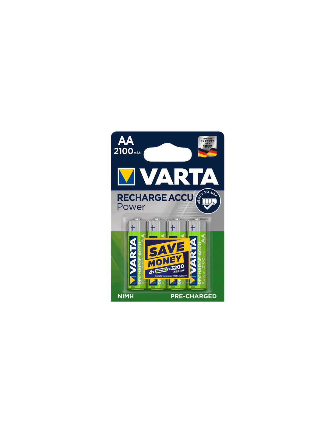 Las pilas recargables Varta AA 2100mA son perfectas para cualquier tipo de uso. Su tamaño es AA y tiene unas medidas de 14.5x50.5mm y un peso de 29gr. Su sistema electroquímico es de Níquel-metal Hidruro (NI/MH) y su capacidad es de 2100mA y su tensión de 1.2V. Las pilas recargables Varta AA 2100mA están precargadas y listas para usar. Además su nivel de autodescarga es muy bajo y no tienen efecto memoria. Son ideales para dispositivos genéricos. Según indicaciones del fabricante, tienen hasta un 75% de carga después de 12 meses. Finalmente indicar que son compatibles con todos los cargadores del mercado, aunque recomendamos elegir el cargador de pilas Varta disponible en DivisionLED !!