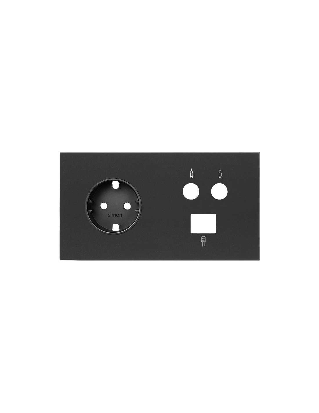 El kit frontal para 2 elementos con una base de enchufe schuko y una toma R-TV+SAT única, con 1 conector RJ45 6 UTP resulta especialmente útil y funcional en numerosos proyectos, tanto domésticos como de locales comerciales o similares. Con un acabado en color negro con efecto mate, presenta un aspecto discreto y muy funcional. Además, es de fácil instalación: el embornamiento del enchufe se realiza mediante un corte, con un sencillo click y listo, sin necesidad de herramientas ni de pelar cables. Por otro lado, el embornamiento de la toma R-TV+SAT debe realizarse a tornillo. Este kit es apto para instalar empotrado en cualquier pared y en instalaciones de hasta 16A de intensidad para el enchufe, y tomas R-TV+SAT acordes al reglamento ICT vigente.Con el kit podrá contar con salida de RJ45 6 UT para internet, la salida de TV, R-TV+SAT y un enchufe para darle salida eléctrica a cualquier dispositivo que se conecte. Lo que hace el kit de la serie Simon 100 es agrupar de forma mínima diferentes funciones para facilitar la instalación y fomentar la comodidad a la hora de la conectividad de dispositivos.