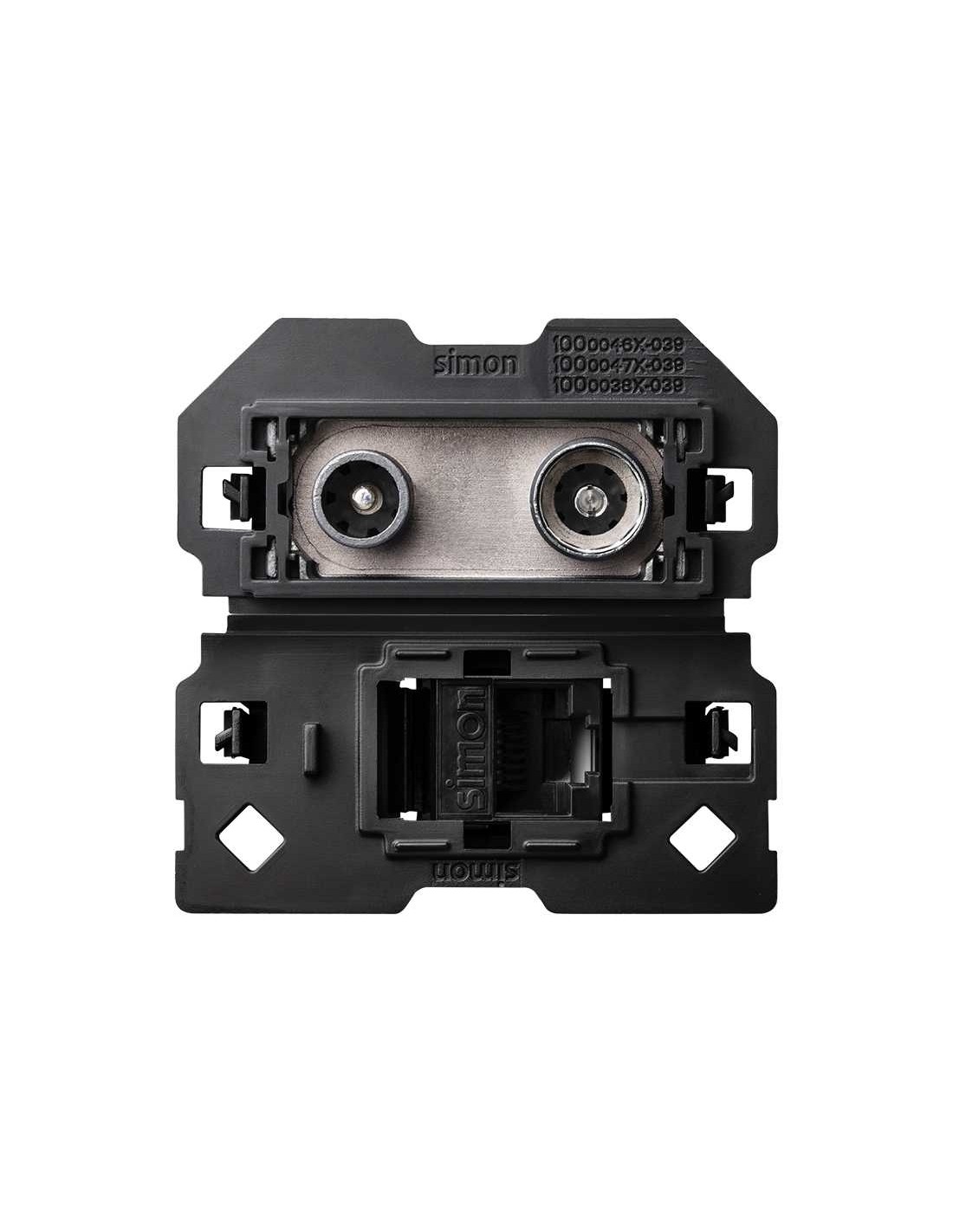 Toma de señal modular R-TV+SAT final y de voz y datos RJ45 categoría 6 UTP Simon 100. Tener una doble función en un mismo dispositivo es una gran ventaja. El ahorro de espacio es evidente y, además, puedes disponer en un mismo punto de las conexiones necesarias para diferentes tecnologías. Esto sucede en la Toma R-TV-SAT final + RJ45 de Categoría 6 de la serie Simon 100, un artículo cuya doble versión y sus tres contactos aumentan sus posibilidades de uso. Esta toma es apta para empotrar, su embornamiento es mediante tornillo y su funcionamiento se realiza a través de inserción. Cumple con el reglamento ICT, es compatible con la TDT y su tipología es Final/UTP. La parte activa queda siempre dentro del mecanismo, sin peligro de que sobresalga ningún hilillo y cause problemas eléctricos y averías. Su mecanismo es intuitivo, sencillo y cómodo y cumple con la normativa N 50083-2:2012, EN 50581:2012, EN 50581:2012, EN 50173:2011, ISO/IEC 11801 Ed 2.2, IEC 60603-7-2 Ed 2.0, IEC 60603-7-3 Ed 2.0, IEC 60603-7-4 Ed 2.0, TIA 568 C.2.