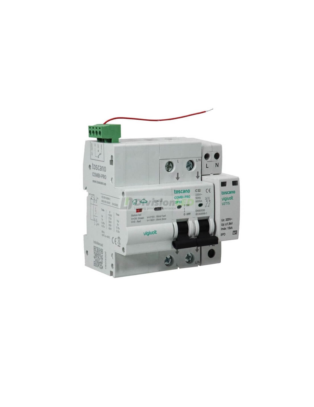 Pertenece a la familia de protecciones contra sobretensiones de Toscano Vigivolt, una de las más extendidas del mercado. Por otro lado indicar que tiene una tensión de disparo de 265 VAC ±2% y se rige por la normativa UNE-EN 50550 / UNE-EN 61643-11